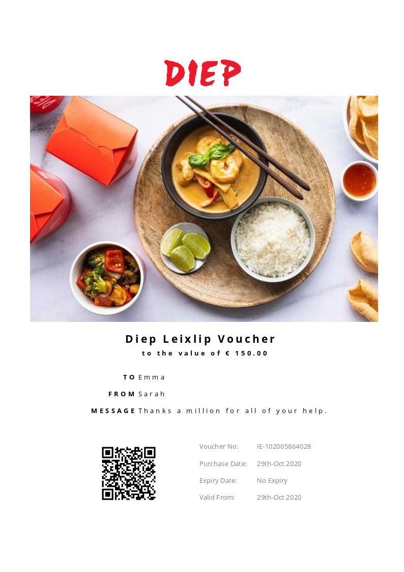 Diep Leixlip allows you to purchase instantly printable gift vouchers, special offers and tickets using the Voucher Connect platform.